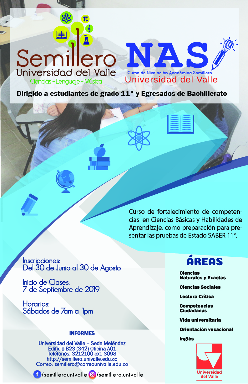 El Curso de Nivelación Académica Semillero permite a estudiantes reforzar los conocimientos en áreas como: Matemáticas, Biología, Química, Física, Inglés, Lectura Crítica, Ciencias sociales y Competencias ciudadanas; aportando una serie de herramientas conceptuales y procedimentales que permitan desarrollar habilidades para enfrentar las pruebas de estado SABER 11°.